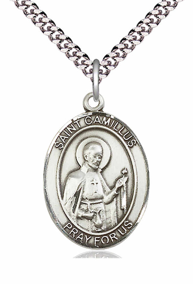 St. Camillus of Lellis Medal - Pewter / 3/4" x 1/2" (Dime Size) / 18" Rhodium Plated Medium Curb Chain with Clasp (1.7mm) is backordered and will ship as soon as it is back in stock.