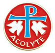 This Acolyte lapel pin is round and measures approximately 1' in diameter. The pin is designed with a Chi Rho cross and two doves. The pin is goldtone with red hand enameled colors. The bottom of the pin reads ""Acolyte"". Comes gift boxed.
