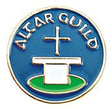 This Altar Guild lapel pin is gold tone with blue, green and white enameled colors. Designed with an altar image. Measures approximately 1' in diameter. Comes gift boxed.