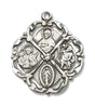 A five way medal does not have to be in the shape of a cross as this unique 5 way medal clearly shows. The pendant has a beautiful scrolled border with lovely images of the Sacred Heart, the Miraculous, St. Joseph and St. Christopher. In the center where the crisscross meets is a raised descending dove.