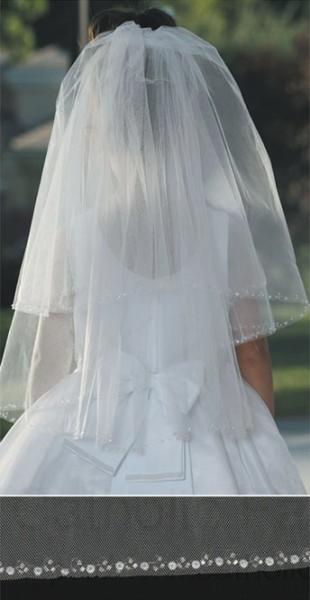Going for a classic and chic look? Look no further! This white First Communion veil is the perfect accessory to complement any hairstyle! The two tiered layered veil is adorned with clear sequins and beading along the edges and easily secured in hair with an attached comb. The perfect accessory for any First Communion dress.