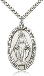 Men's Elongated Oval Miraculous Medal Necklace - Sterling Silver / 1 5/8" x 1" / 24" Light Rhodium Heavy Curb Chain with clasp (2.9mm) is backordered and will ship as soon as it is back in stock.