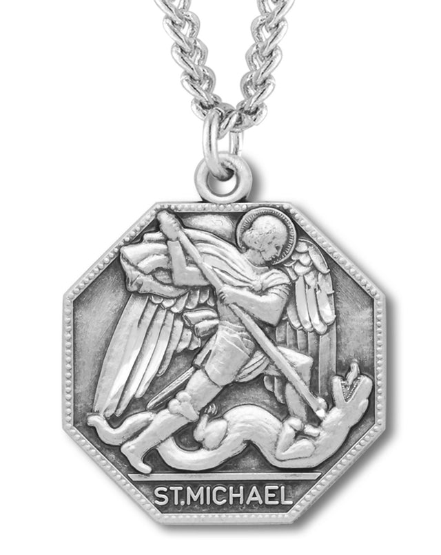 Octagon Shape St. Michael Medal for Men - Sterling Silver / 1 1/8" x 7/8" / 24" Surgical Stainless Steel Heavy Curb Chain with Clasp is backordered and will ship as soon as it is back in stock.