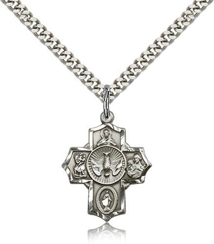 If you are looking for a pendant that marks the importance of the Holy Spirit, look no further. This 5-way medal is designed with a large descending dove in the center. The classic images of the five way medal are also included; Sacred Heart, the Miraculous, St. Joseph and St. Christopher.