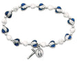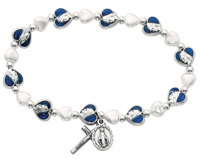 This bracelet ticks all the right boxes as it combines white glass hearts beads with with silver and blue enameled heart beads. The double-sided blue and silver hearts have an image of the face of the Blessed Mother. To add to the bracelets 'charm' are two silver oxidized small charm pendants, one cross charm and one Miraculous charm.