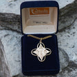 Open Cut Four-Way Medal - Sterling Silver / 1 1/4" x 1 1/8" / 24" Rhodium Plated Heavy Curb Chain with Clasp (2.4mm) is backordered and will ship as soon as it is back in stock.