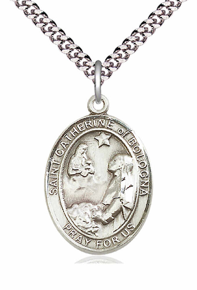 St. Catherine of Bologna Medal - Pewter / 3/4" x 1/2" (Dime Size) / 18" Rhodium Plated Medium Curb Chain with Clasp (1.7mm) is backordered and will ship as soon as it is back in stock.