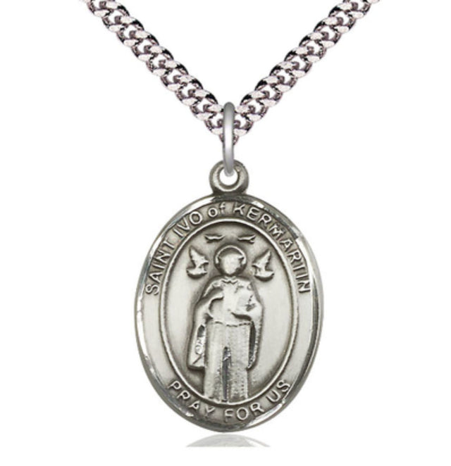 St. Ivo of Kermartin Medal - Pewter / 3/4" x 1/2" (Dime Size) / 18" Rhodium Plated Medium Curb Chain with Clasp (1.7mm) is backordered and will ship as soon as it is back in stock.