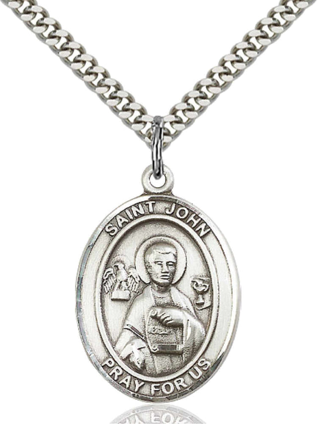 St. John the Apostle Medal - Pewter / 3/4" x 1/2" (Dime Size) / 18" Rhodium Plated Medium Curb Chain with Clasp (1.7mm) is backordered and will ship as soon as it is back in stock.