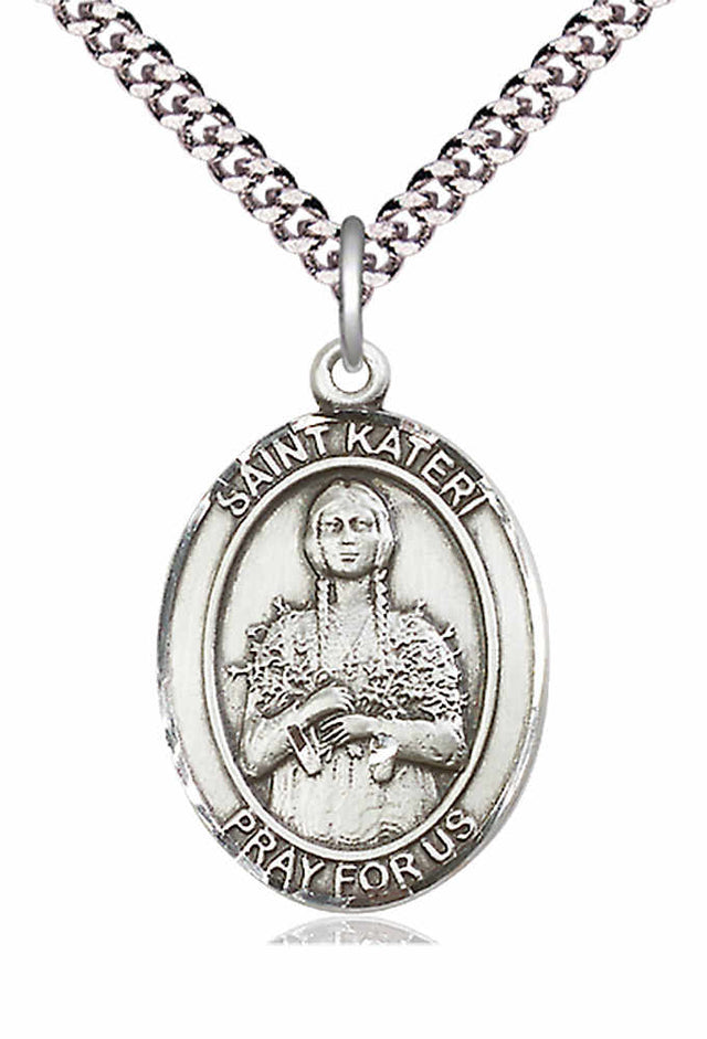St. Kateri Medal - Pewter / 3/4" x 1/2" (Dime Size) / 18" Rhodium Plated Medium Curb Chain with Clasp (1.7mm) is backordered and will ship as soon as it is back in stock.