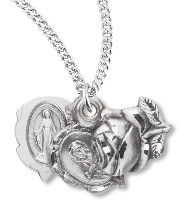 We love that you have three subjects captured in one beautiful pendant. On the front and back is a high relief rosebud. Gently slide the rosebud to reveal a Miraculous medal and a Scapular / Sacred Heart medal too. Keep the Blessed Mother and Our Lord close to you!