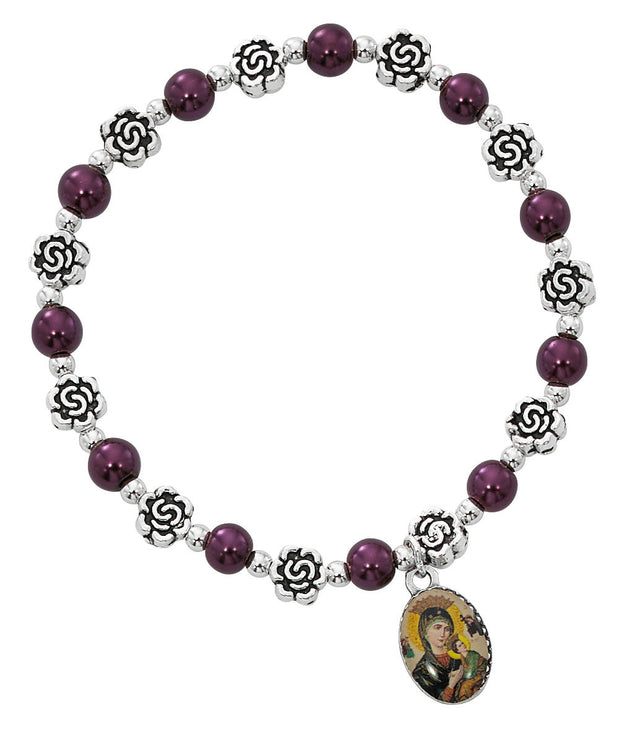 A full color dangle charm of Our Lady of Perpetual help is combined with beautiful burgundy glass beads and floral shaped beads. This bracelet is not only gorgeous, but super comfortable too!