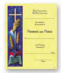 With gorgeous royal colors of blue, gold, and red this Penance / Reconciliation Certificate will be well received. The symbols of the cross, a priest's blessing hand, grapes, wheat, and the Chi Rho are all represented in this design.