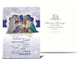 In Catholocism the color royal blue signifies royalty and the coming of a king. The use of blue and regal colors throughout make this Christmas card set a standout. On the front of the card is a stunning image of the Three Kings and the Holy Family with a blue starlit sky. The text is that of Silent Night.