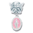 This beautiful baby pin is made of fine sterling silver with the image of an angel with folded hands in prayer above a pendant showing the virgin Mary and comes in a Deluxe Velour Gift Box.