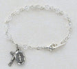 This elegant baby bracelet is sure to please. It is 5.5' in length and designed with tin cut crystal beads and a dangling oval Miraculous charm and Crucifix charm that are made of either sterling silver or pewter. Comes boxed.