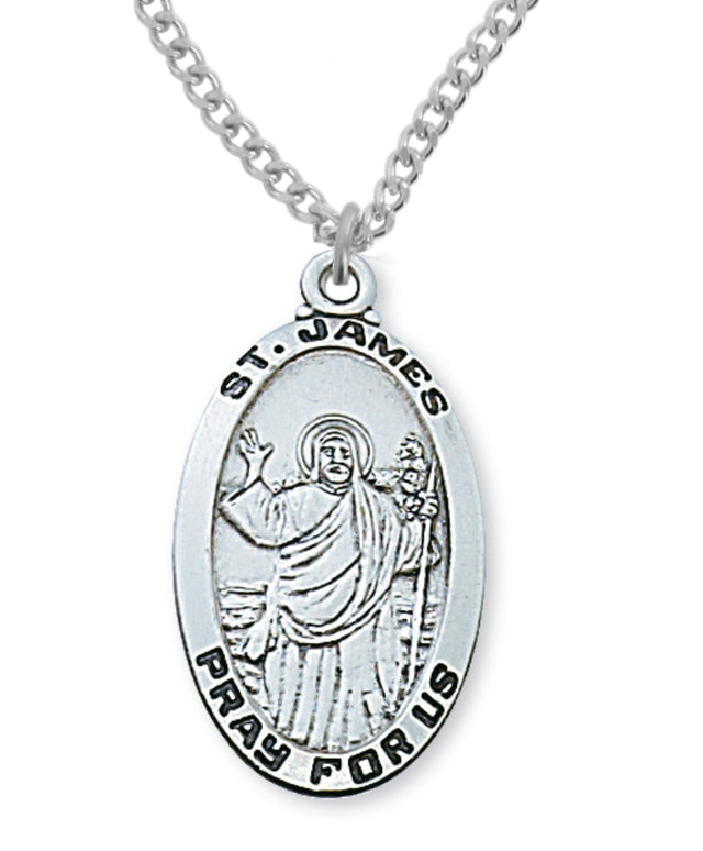 Oval sterling Silver Saint James Necklace with traditional design. The border text reads Saint James Pray For Us. He is the patron saint of Pharmacists.