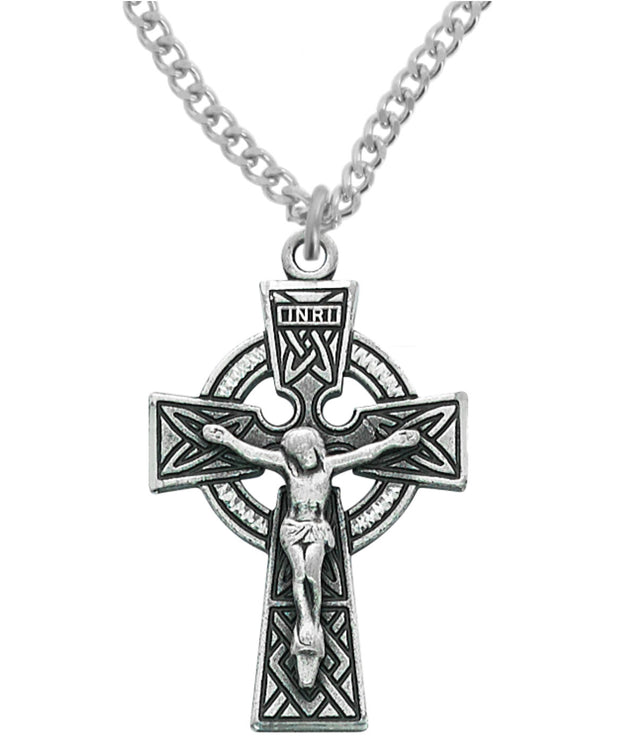 An attractive Celtic crucifix necklace. We really like the Celtic design used on the cross bars and the open-cut radial center. The corpus of Christ is raised and has nice detailing.