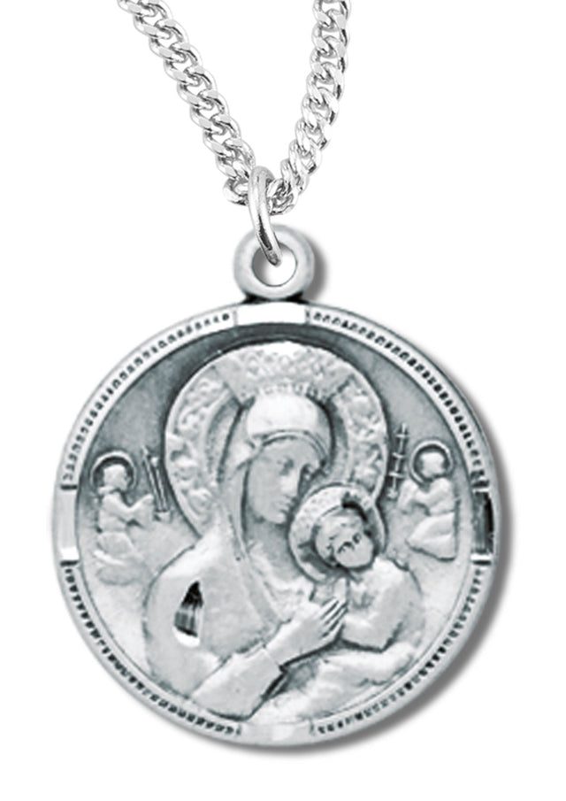 What a pretty necklace to wear in honor of Our Lady of Perpetual Help. The elegant medallion is made in a round shape with a beaded hand etched border. In the center is a beautiful image of the Blessed Mother holding the Christ Child flanked by two angels.