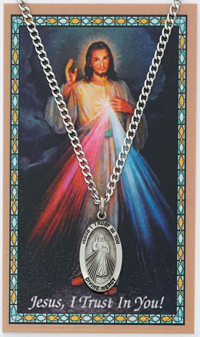 This Divine Mercy medal and prayer card set include a pewter medallion with matching chain and a plastic laminated prayer card. This pendant displays an image of Jesus letting the love the mercy from his heart flow out from his robe to those in need. On the reverse side is a wonderful image of St. Maria Faustina know as the Apostle of Mercy. This wonderful medal has the following features;