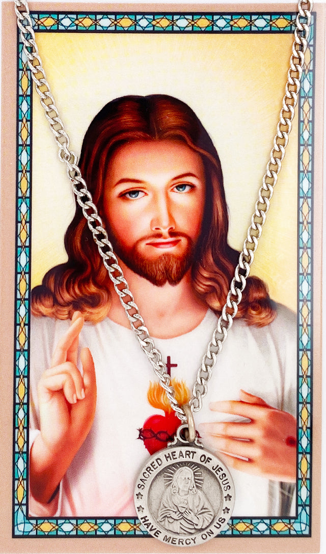 Round Sacred Heart Medal with Prayer Card - Silver tone / 3/4" Diameter is backordered and will ship as soon as it is back in stock.