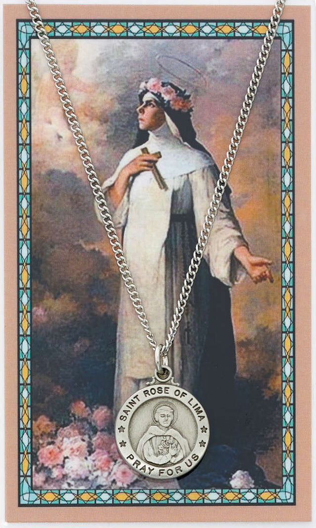 - The medallion displays a classic image of St. Rose holding a crucifix and wearing a crown of roses.