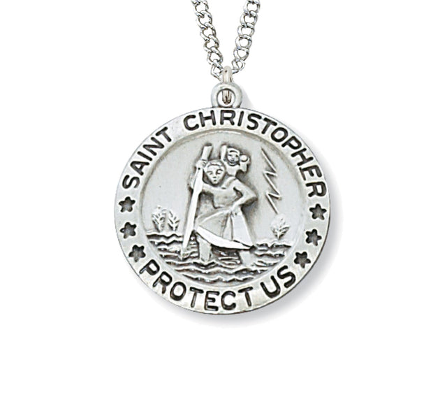 A smaller Saint Christopher necklace that is ideal for a young person or petite woman. The medal is round shaped and made of sterling silver. Design features the text Saint Christopher Protect Us around the border and an image of the saint in the center.
