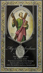 The prayer card pamphlet measures approximately 3 1/4 inch x 5 1/2 inch. The pendant is made of pewter and comes with an endless 24 inch long stainless steel chain. Pendant size is 1 inch H x 7/8 inch W. Made in Italy.