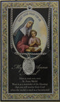 This lovely pendant and prayer card set features a pewter medal of St. Anne paired with a beautiful gold foil embossed prayer card pamphlet. The pamphlet comes complete with the biography and history of the Saint, their Patronage, Feast Day and Prayer. The front of the prayer card depicts the image of St. Anne. The pamphlet opens up to display the biography and history of St. Anne. The back panel of the card displays the prayer to St. Anne.