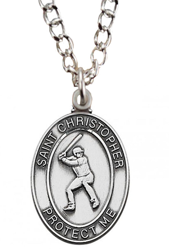 This is a hand engraved New England pewter St. Christopher Baseball Medal that includes a matching 24' chain and comes in a clear plastic gift box.