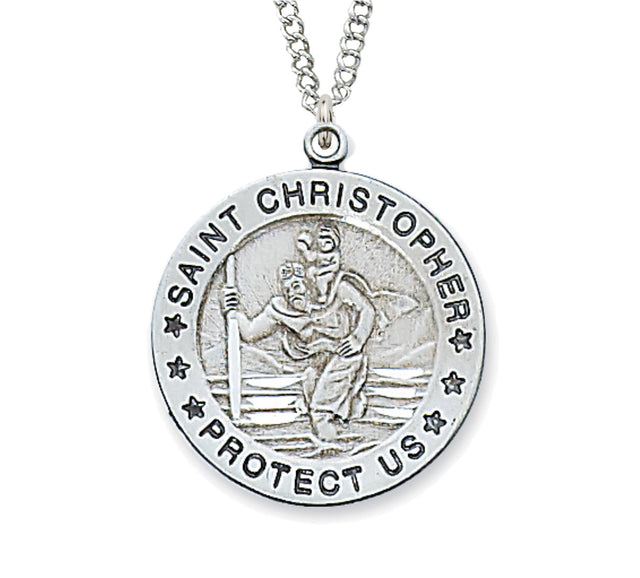 Classic round shaped Saint Christopher pendant in sterling silver. This necklace features the text Saint Christopher Protect Us around the border and an image of the saint in the center.