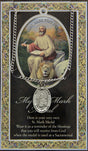 The prayer card pamphlet measures approximately 3 1/4 inch x 5 1/2 inch. The pendant is made of pewter and comes with an endless 24 inch long stainless steel chain. Pendant size is 1 1/8 inch high. Made in Italy.