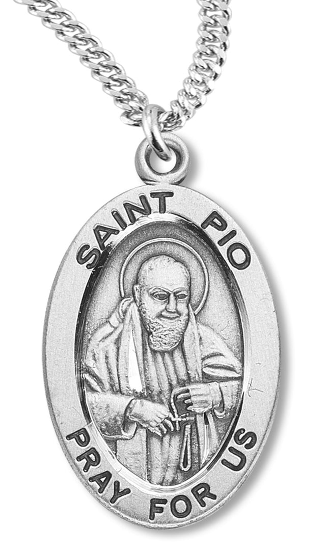 St. Pio Medal Sterling Silver - Sterling Silver / 1 1/8" x 11/16" / 24" Surgical Stainless Steel Heavy Curb Chain Clasped is backordered and will ship as soon as it is back in stock.