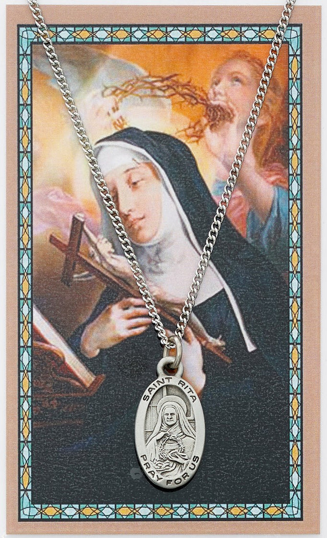 St. Rita of Cascia Medal with Prayer Card - Silver tone / 7/8" x 1/2" is backordered and will ship as soon as it is back in stock.