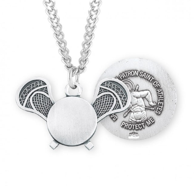 This handsome St. Sebastian Lacrosse pendant is the perfect gift for any young athlete. Its unique design is created with a high quality Sterling Silver cast which features intricate details of the sport. Features of The St. Sebastian pendant are: