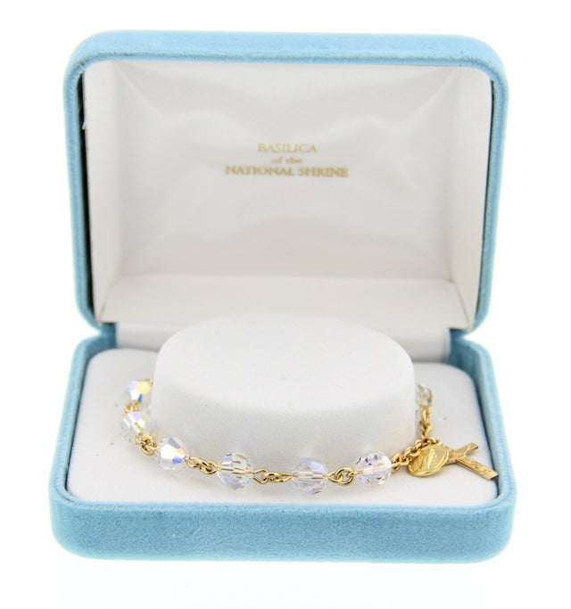 There is a lot to love about this rosary bracelet! The shimmering 6mm Swarovski faceted beads are paired with 14K gold plated findings that create an elegant bracelet that can be worn for a special occasion as well as everyday. There are two dangling charms, one Miraculous and the other a cross with raised corpus.