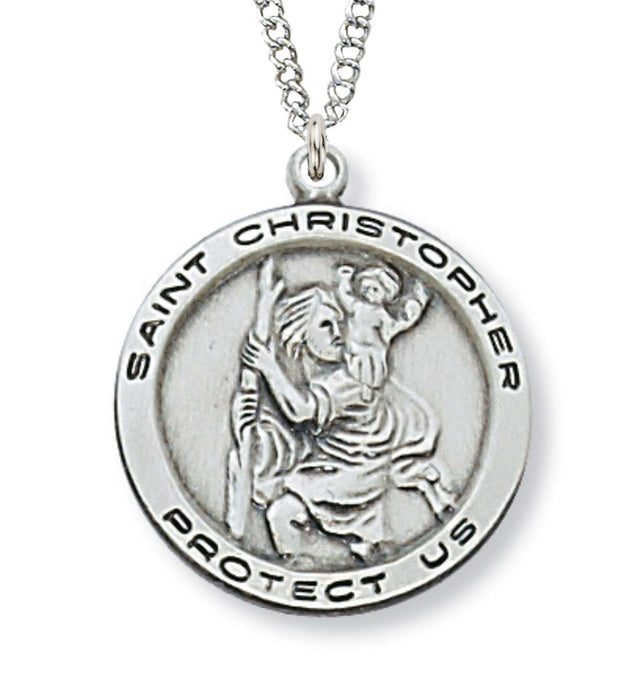 This Saint Christopher Medal is an ideal size for a woman or younger person. Liked by all, the round shaped pendant has an image of Saint Christopher in the center and on the raised border the text reads Saint Christopher Protect Us. He is the patron saint of travel and travelers.