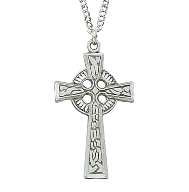 Slender and tall women's Celtic cross necklace. There are four open-cut circles int he center and a very pretty Celtic design on the crossbars.