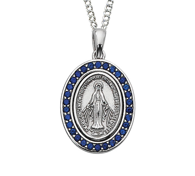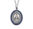 This beautiful Miraculous pendant is oval in shape and has lovely glass sapphire colored blue stones around the border. The pendant shimmers in the light and will make for perfect everyday wearing. Keep the Blessed Mother and her graces with you as you wear this sterling silver pendant. An image of the Miraculous is in the center of the pendant and on the back of the pendant is the Miraculous symbol.