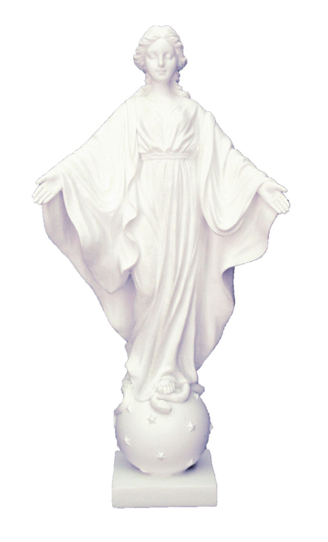 This magnificent Our Lady of the Smiles statue has been created from white resin and stands on a white base. She has been crafted with much attention to detail and the linear contours are amazing! Her arms are outstretched and her eyes are gently closed in prayer. This glorious statue would make a great addition to your indoor or outdoor decor.