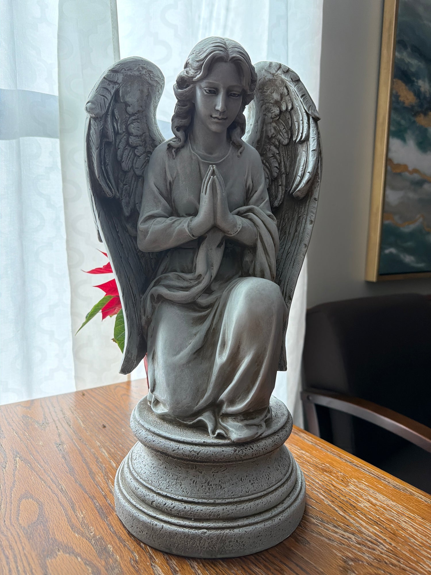 The garden angel statue exudes a silent beauty as she kneels in prayer on a round pedestal. The angel's garment and hair have a flowing’s style to them. The hands and face have the beautiful detail to them. Her wings are intricately carved and are elegantly outstretched.