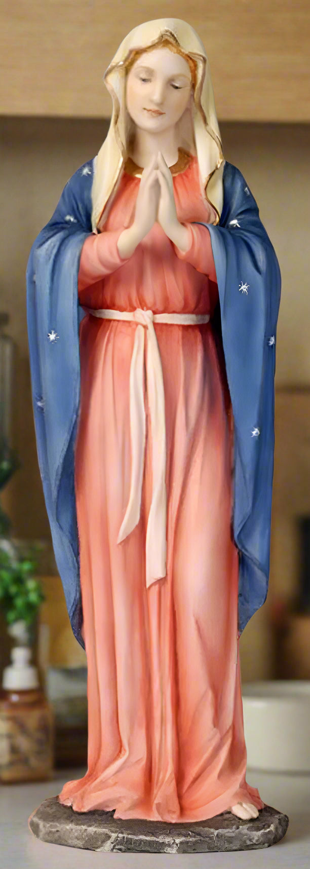This magnificent Praying Madonna statue has been created from hand painted resin. She has been crafted with much attention to detail and the color contrasts are amazing! She wears blue and red garments with a pale yellow veil outlined in gold. Her dark blue cape is accented with all over stars. This glorious statue would make a great addition to your indoor decor.