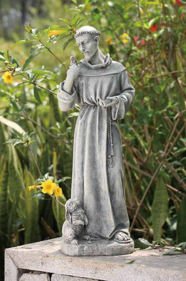 This is a statue of St. Francis admiring the bird on his shoulder with the rabbit at his feet. The statue is made from a durable resin/stone mix material. St. Francis would make a great addition to your garden decor.