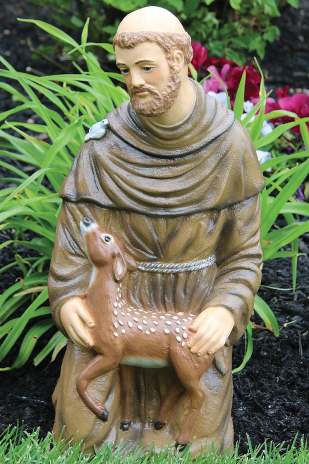 We love this Saint Francis of Assisi, the beloved patron saint of animals, gently standing beside a fawn. This 21-inch statue, crafted from concrete material for lasting beauty, is a constant reminder of St. Francis's message of peace and harmony with nature. A perfect addition to any garden or grotto.
