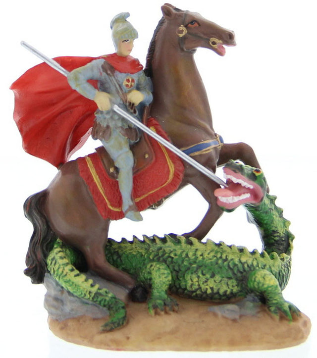 This small St. George statue depicts the Saint's legendary slaying of a dragon. St. George was a notable Roman soldier but when he refused the Emperor's request to make a sacrifice to the Roman gods because he was a Christian and follower of Jesus Christ. George was tortured and executed for his belief. Many pray to St. George for courage and protection.
