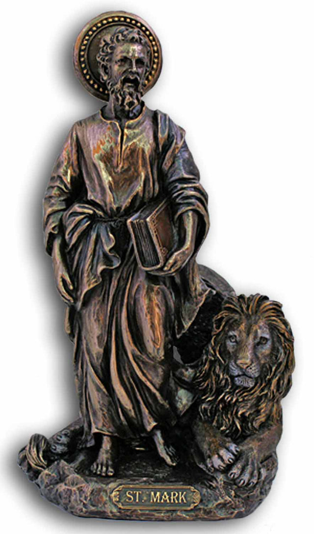 St. Mark the Evangelist is the patron saint of notaries. In this majestic statue he is pictured with the lion which is derived from Mark's description of John the Baptist as a 'voice of one crying out in the desert' (Mark 1:3), which was compared to a roaring lion. Crafted in a bronzed resin finish, not only is he the perfect size for any flat surface, he is also suitable for an indoor or outdoorsetting! If St. Mark is who your devition is for, he would make the perfect spiritual addition.