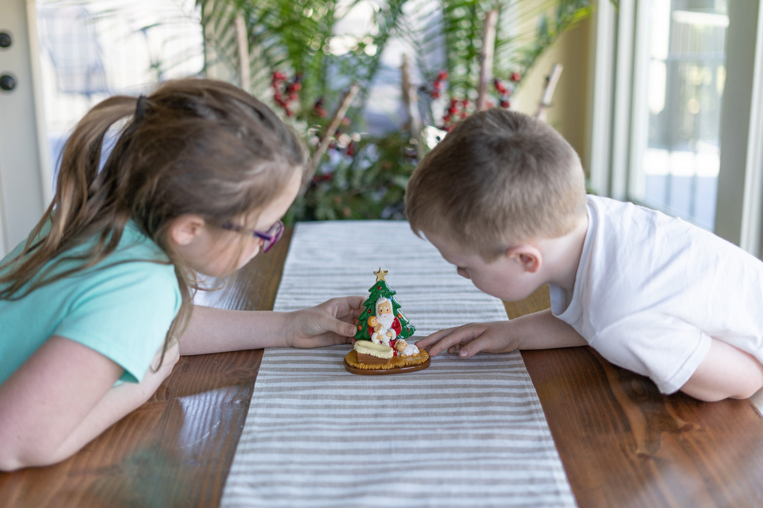 This 5 inch one piece statue remembers the Greatest Gift of All Time. Santa holding Baby Jesus by the Christmas Tree is sure to delight young and old alike. A great gift for children, parents, teachers. Brightly colored and perfect for display on a shelf or table, this joyful statue remembers the reason for the season. Made of Resin.