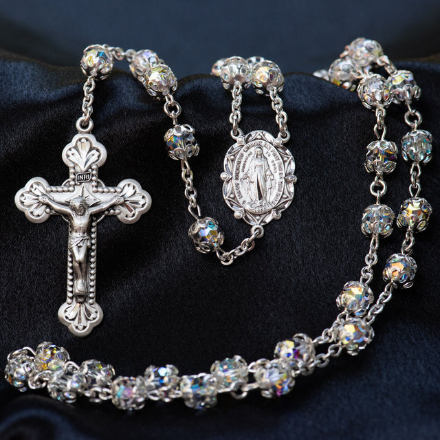 - The 5 decade rosary features 7mm round Swarovski crystal Aurora borealis beads.