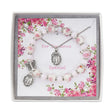A jewelry set perfect for a girl's First Holy Communion with a stretch bracelet and matching pendant necklace. The bracelet is so comfortable and pretty too! It has Venetian glass beads with a pink and white pearl and alternating silver beads with clear glass stones. A butterfly and Miraculous charm finish the youthful design. The pendant is designed as a pretty Miraculous pendant with an oval shape and elegant scroll edges.