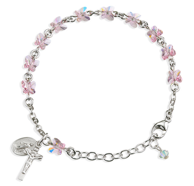 Lovely and feminine, this stunning Light Rose Austrian crystal butterfly shaped bead rosary bracelet is truly a thoughtful gift. These fine Austrian crystal beads will shimmer and shine on your wrist. Whether you are wearing this bracelet to dress up an outfit or just to feel the comfort of your blessed devotion, it will fully satisfy you with its beauty and grace! A Sterling Silver Miraculous medal and low relief Crucifix charm dangles gently from the bracelet.